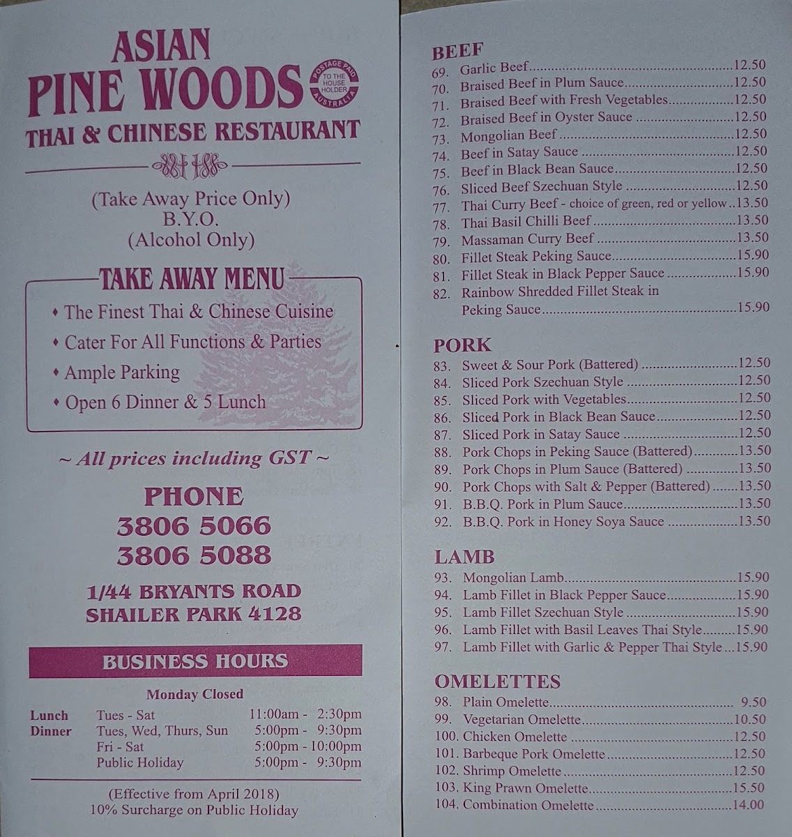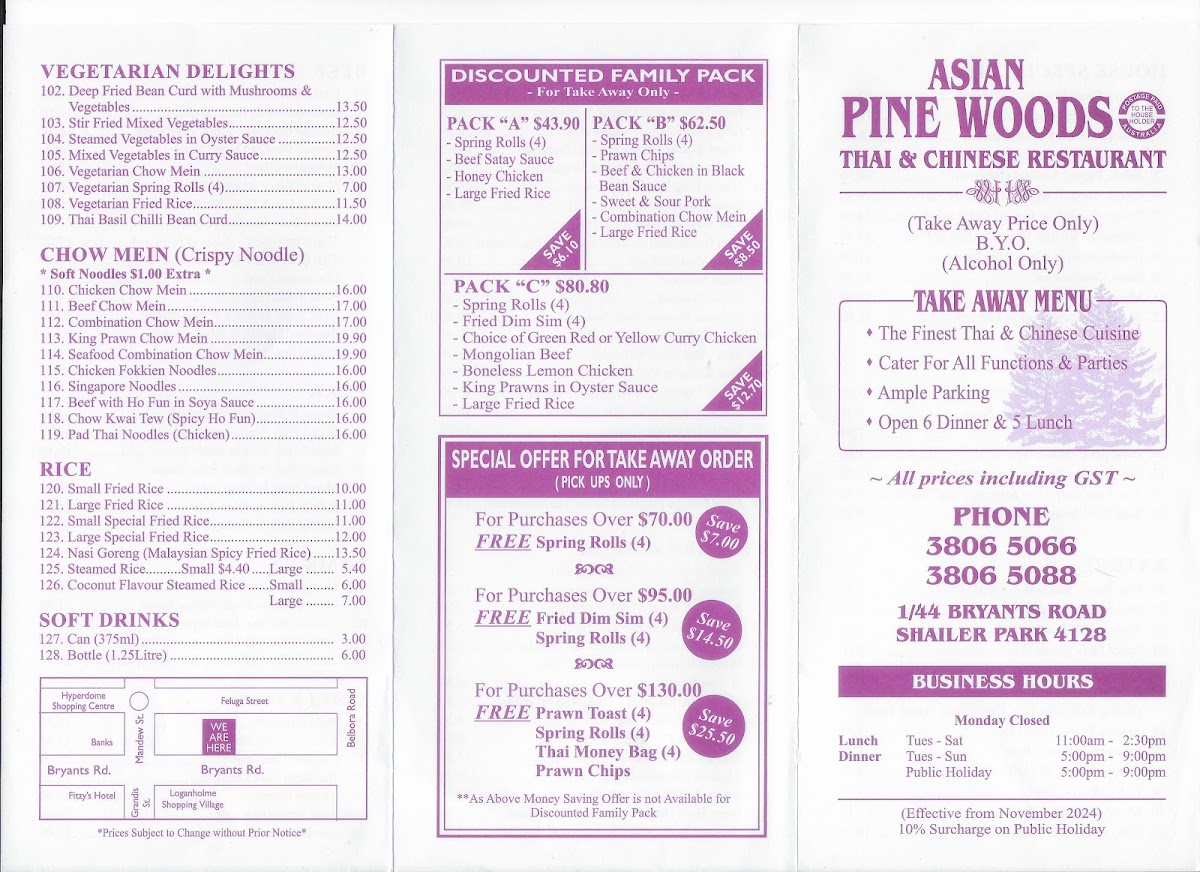 Pine Woods Asian Restaurant offers a diverse menu that expertly blends traditional Asian flavors with fresh ingredients. The standout dishes include the Braised Duck with Mushrooms and Vegetables, a rich and savory option with tender duck that pairs perfectly with earthy mushrooms and a variety of vegetables. For those craving something crispy, the Salt & Pepper Calamari delivers a satisfying crunch, seasoned just right with a bold kick of pepper. The Combination Chow Mein is a hearty and satisfying dish, loaded with a mix of meats and vegetables tossed in a deliciously savory sauce, making it a perfect choice for anyone who enjoys a well-rounded noodle dish. Additionally, the Steamed Mixed Vegetables provide a light, healthy complement to any meal, with a delightful variety of fresh, steamed vegetables. Each dish on the menu is prepared with care, offering authentic flavors and high-quality ingredients that make Pine Woods a must-visit spot for anyone in the area.